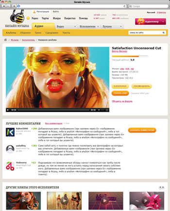 Различные версии заглавной страницы музыкального ресурса. Сложность разработки визуальной части для всех сайтов состояла в том, что они должны были отвечать требованиям фирменного стиля и быть, при этом, одновременно похожими и различимыми. На основе идей первых трёх версий, была реализована финальная — четвёртая.